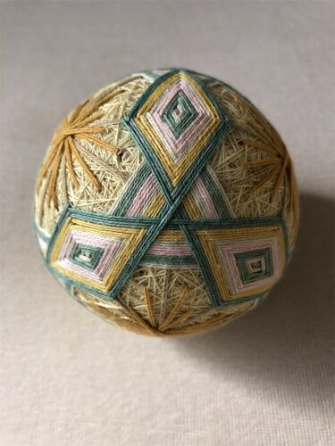 こんにちは!なっきーです この『やさしい交差花』は、交差かがりの入門編として考案された模様です。 ひし形になっている部分が交差しています。 これも初級クラスのときに作ったものですが、かがり方がやさしい割に可愛らしい手まりに仕上がったので、とて…